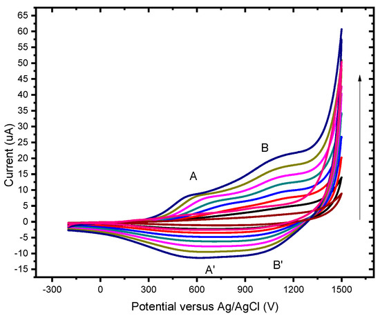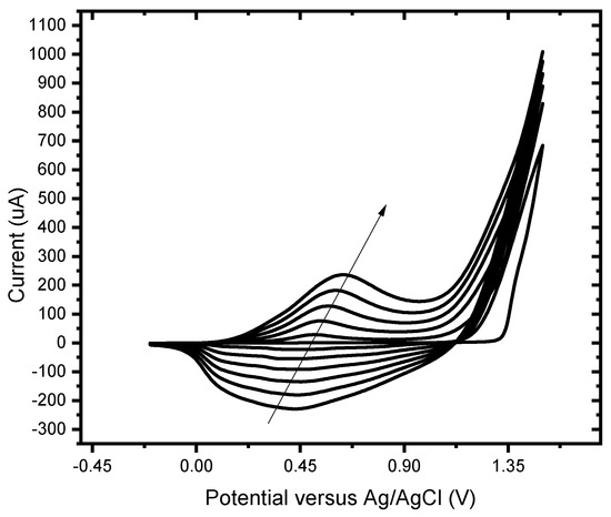 The analytical behaviour of gallic acid (GA) was studied at the BDD unmodified electrode and BDD/P3MT chemical sensor in 0.1 M phosphate buffer at pH 6.6 at different scan rates from 10 to 100 mV/s (Figure 9 and Figure 10). An irreversible anodic CV wave was observed at 600 mV vs. Ag/AgCl in the electrochemical window of −200 mV to 1500 mV. The anodic current corresponds to the direct electrochemical oxidation of the GA to its quinone.