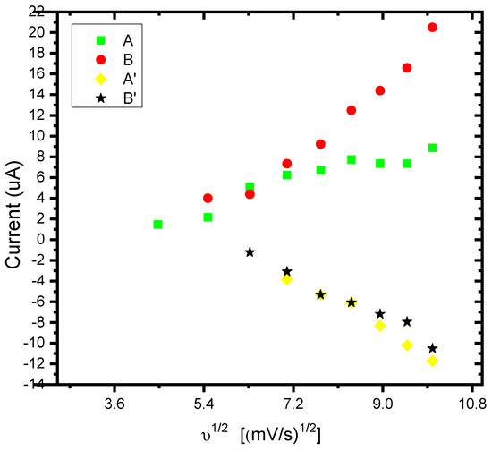 The linear dependence of the peak currents of anodic peak A on the scan rate indicated that we have a thin film of the surface-bound conducting electroactive polymer undergoing a rapid, reversible electron transfer reaction [97]. Figure 5 illustrates the dependence plot of the cathodic peak current (Ip,c) as a function of the square root (υ1/2) of the potential scan rate (correlation coefficient, R2 = 0.97 and slope 2.5) for the P3MT film, related to the peak labelled B. This confirms the diffusion-controlled cathodic peak current arising from the electron propagation through the polymer chain. The Randel–Sevćik equation was used to determine the diffusion coefficient of the electrons (De) within the polymer. The slope of the straight line derived from the Ip,c versus υ1/2 plot (Figure 4) may be used to calculate De. The diffusion coefficient (De) was calculated to be 3.6 × 10−10 cm2/s for the polymer film [77,97,98,99,100]. The increasing amplitude of the redox peaks with repeated potential scans indicated that the polymer deposited at the BDD surface was conducting.