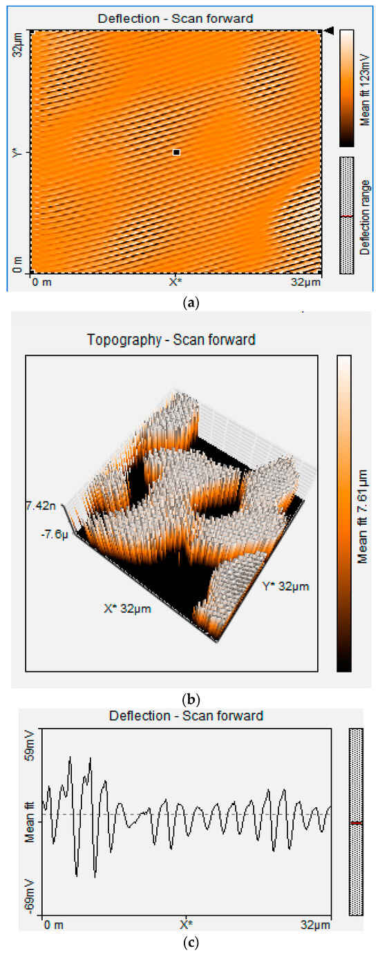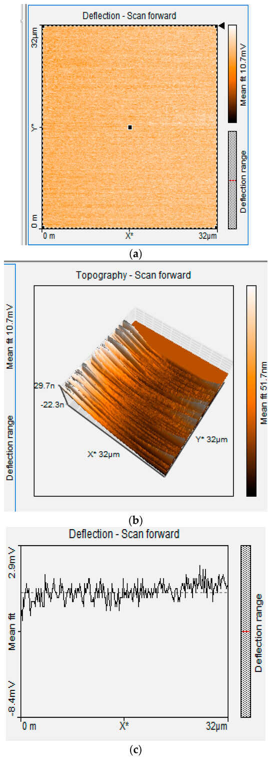Table 1 presents the results of roughness assessments of unmodified BDD and P3MT/BDD film surfaces using Atomic Force Microscopy (AFM), providing information on surface areas and corresponding roughness values. A smooth surface was observed for unmodified BDD in all image sizes (32 × 32 μm and 8 × 8 μm). The voltage applied was 500 mV and 1000 mV. Generally, the deflection scan’s low values correspond to topological depths. The AFM images show that the films are homogeneous for 32 × 32 μm BDD/P3MT at 500 mV (Figure 8). The thickness of these films was measured to be ~21.4 nm from the scale of the 3D view of the AFM image [65].