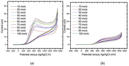 Cyclic voltammograms of 0.1 mM gallic acid in phosphate buffer solution (pH 6.6) at (a) the unmodified BDD electrode and (b) BDD/P3MT in the potential range from −200 mV to 1500 mV at scan rates of 10–100 mV/s.