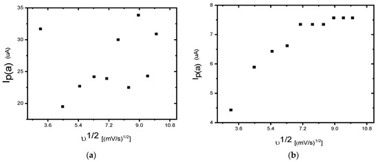 Calibration plot obtained for the scan rate study by cyclic voltammetry of 0.1 mM gallic acid in phosphate buffer solution (pH 6.6) at the (a) unmodified BDD electrode and (b) BDD/P3MT in the potential range from −200 mV to 1500 mV at scan rates of 10–100 mV/s.