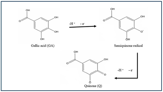 GA is an electroactive molecule distinguished by particular redox reactions caused by the presence of three hydroxyl groups in the aromatic structure. The two GA hydroxyl groups are deprotonated, while two electrons and two protons are generated; the GA is irreversibly oxidised first into a semi-quinone radical and then into quinone, according to the equation (Figure 11). The semi-quinone is highly unstable and may rapidly decay through dimerization or polycondensation reactions. The above findings strongly suggest the exclusion of the possibility of dimerisation or polycondensation reactions.