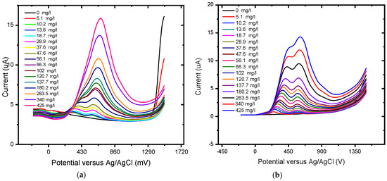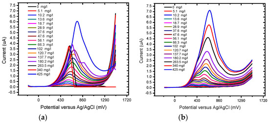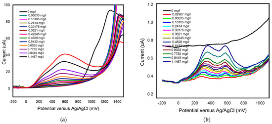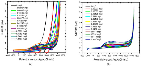 Concentration study of 0.1 mM gallic acid (0 mg/L to 1.1467 mg/L) in phosphate buffer solution (pH 6.6) at the (a) unmodified BDD electrode and (b) BDD/P3MT in the potential range from −200 mV to 1500 mV.