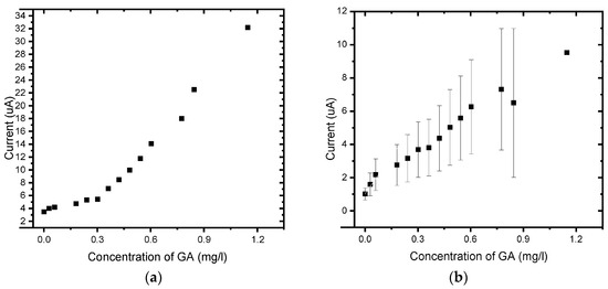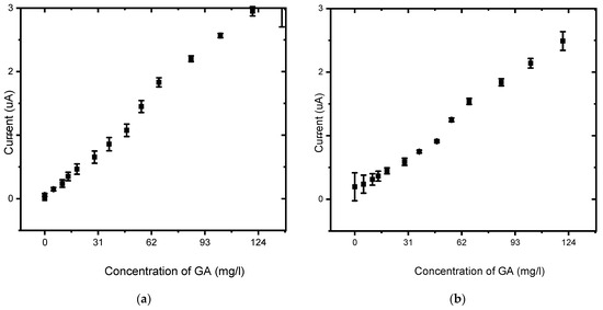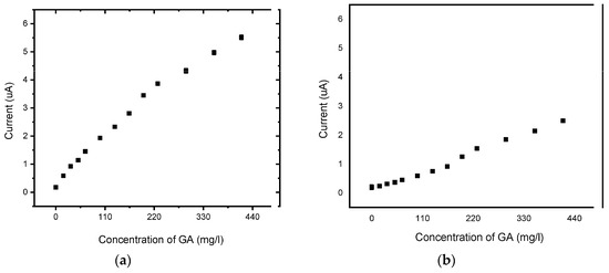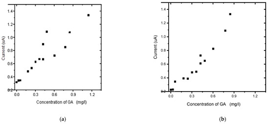 CVs of the detection of GA on the BDD electrode and BDD/P3MT at pH 6.6 exhibited one irreversible anodic peak. BDD/P3MT exhibited a higher sensitivity towards the detection of GA than BDD, i.e., 1.23 × 10−2 mg/L versus 1.78 × 10−2 mg/L for BDD, both systems acquiring an R2 value of 0.98, as shown in Figure 12 and Figure 13.