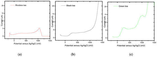 In this particular case study, a selection of tea was obtained commercially from supermarkets in Cape Town, South Africa, as a representation of the main types of tea consumed in South Africa. This included black tea (Joko®), green tea (Woolworths Food®), and red rooibos tea (Joko®), which South Africans widely consume. The content of tea in any given teabag was weighed, dissolved in 100 mL of recently boiled water, and left to steep for 10 min. The tea extract was then filtered and left to cool at room temperature. Tea extracts were diluted with buffer (0.1 M phosphate buffer solution, pH 6.6) at ratios of 3:1, 3:2, 3:3, and 3:6 to find the optimum balance between electrolyte conductivity and sample responsiveness. In screening the samples for redox activity using cyclic voltammetry, the most pronounced electrochemical signals were observed for the samples prepared as a 3:2 tea to buffer ratio, respectively. This ratio was used for all tea samples; ten tea bags were screened per tea type. From the initial sample size of 30 tea bags, only those samples that registered an electrochemical profile in the potential window (−200 and +1500 mV at a scan rate of 50 mV/s (versus Ag/AgCl)) were retained for the quantitative assessment of phenols. Rooibos tea produced 3/10 samples for the phenol content analysis, whereas green tea produced 10/10 and black tea produced 6/10.
