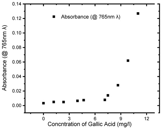 Gallic acid (3,4,5-trihydroxy benzoic acid) is the most popular hydroxybenzoic acid. It is among the most representative phenolic-type compounds present in numerous dietary substances and food wastewaters (agricultural (tea) effluent, olive oil factories, boiling cork process, and other industrial synthetic effluents) [81,82,83,84]. Gallic acid (GA) is widely known for its excellent antioxidant and antiradical activity in multiple biological and pharmaceutical applications owing to its structure. It is favoured for its antibacterial, anti-mutagenic, antiviral, anti-inflammatory, antihistaminic, antitumor, anti-cancerous and anti-diabetic properties, as well as protection against cardiovascular diseases [85]. GA is broadly utilised as a standard for the assurance of total polyphenolic substance in several analytes by the Folin–Ciocalteu test [82,83]. Different strategies have been utilized for the self-assurance of GA, such as high-performance liquid chromatography (HPLC), stream infusion examination, a switch stream spectrophotometry photoelectrochemical strategy, and electrochemical strategies [85,86,87,88]. The quantification of polyphenols at carbon nanomaterials, metal oxides, and redox polymers by electrochemical means is expressed as gallic acid equivalents (GAEs) [81,89,90,91].