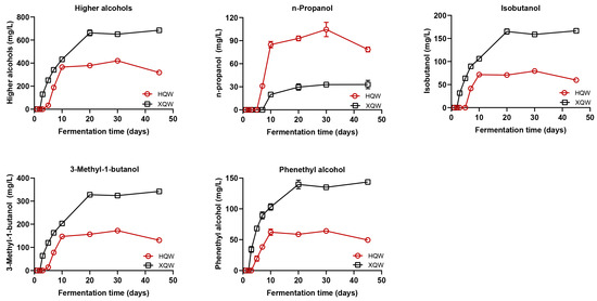 The dynamics of higher alcohols (including n-propanol, isobutanol, 3-methyl-1-butanol, and phenethyl alcohol) during the HQW and XQW brewing processes.