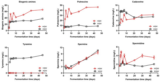 Rice wine contains a large amount of BAs. An appropriate amount of BAs has a positive effect on promoting human growth, enhancing metabolic vitality, and clearing free radicals in the body. However, when the human body takes in too much BAs from foods, blood vessels and arteries will relax, resulting in migraines and other hazards [42,43]. As can be seen in Figure 3, the BA contents in the HQW and XQW brewing processes showed a gradual increasing trend during the whole fermentation process, although there were certain fluctuations. At the end of fermentation, the BA content in HQW was significantly higher than that in XQW (65.61 mg/L and 37.48 mg/L, respectively). Among them, the contents of BAs in HQW fluctuated from the 5th to the 10th day of fermentation, which might be due to the production of amine oxidase by some microorganisms to degrade BAs [27]. In addition, putrescine is the most abundant BA in HQW [44], which is mainly produced at the early stage of fermentation. The concentrations of putrescine in HQW and XQW at the end of fermentation were 46.10 mg/L and 8.83 mg/L, respectively. In addition, the content of spermidine in HQW was slightly higher than that in XQW. However, tyramine was only detected in XQW, and its content in XQW was 10.54 mg/L at the end of fermentation. There were no significant differences in the levels of cadaverine and spermine between HQW and XQW. At present, some countries only set a limit standard for the histamine content in wine, among which the highest limit standard is 10 mg/L in Australia and Switzerland and 8 mg/L in France, and the most stringent requirement is 2 mg/L in Germany [45]. Notably, histamine was not detected in HQW and XQW. Furthermore, according to the recommendations of the European Food Safety Authority (EFSA), the daily intake of tyramine should not exceed 800 mg/kg [46].
