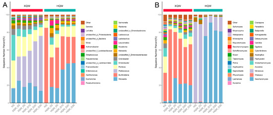 As depicted in Figure 1, in the early stage of the HQW brewing process (day 1–day 7), the reducing sugar concentration showed a sharp increasing trend, reached a peak (155.17 mg/mL) on the seventh day, and a sharp downward trend followed. In contrast, the concentration of reducing sugar did not show a sharp increase during the XQW brewing process, although it increased slightly on the third day of the fermentation process and then displayed a slow decline. The high starch substrate in the initial stage of fermentation is conducive to the growth and reproduction of amylase-producing microorganisms such as Aspergillus and Rhizopus, and it promotes the hydrolysis of starch to reduce sugar. As the fermentation progresses, the reducing sugar is gradually converted by the yeast into alcohol, which, in turn, inhibits the activity of the amylase-producing microorganisms [36,37]. Consequently, the content of reducing sugar exhibited a decreasing trend. At the early stage of brewing, the reducing sugar content was observed to be higher in HQW compared to XQW, indicating that the microorganisms in the HQW brewing process had better liquefaction and saccharification capabilities, or that the microorganisms in the XQW brewing process had more powerful glycolysis capabilities. During the early and middle stages of fermentation (day 1–day 20), the alcohol content in both HQW and XQW showed a gradually increasing trend. In contrast, in the late stage of fermentation (after day 20), the microorganisms in Jiupei consumed a large amount of nutrients, the growth activity of the yeast was inhibited, and the efficiency of the conversion of reducing sugar to alcohol was greatly reduced, at which time the alcohol yield reached its maximum [38]. It is noteworthy that the alcohol concentration of HQW was lower than that of XQW when fermentation was completed. As a key index of the fermentation of Chinese rice wine, the acidity reflects and affects the growth and metabolism of microorganisms in the fermentation process. From the perspective of drinking comfort, the acidity of Chinese rice wine was best when it was no higher than 10 g/L. At present, the acidity control of the Chinese rice wine brewing process is a big problem in the industry, and some types of Qu easily lead to high acidity. It was observed that both HQW and XQW experienced a period of significant increase in total acidity during the initial stage of the rice wine brewing process, followed by a stabilization of the total acidity in the later stage of brewing. At the end of fermentation, the total acidity of XQW reached 10.54 g/L, which was significantly higher than that of HQW (5.59 g/L). Amino acids give rice wine taste characteristics, such as umami, sweet, bitter, and astringent. Additionally, amino acids are important nutrients and flavor precursors, providing nitrogen sources for microbial growth during fermentation [39]. As a key component, amino acids are mainly derived from the hydrolysis of proteins in raw materials. Taking rice wine brewing as an example, glutinous rice, as one of the commonly used raw materials, is rich in protein. During the brewing process of rice wine, protease and carboxypeptidase secreted by Aspergillus and Monascus act on the proteins in glutinous rice to produce amino acids or oligopeptides. This may be the reason for the increase in amino acid nitrogen during the rice wine brewing process. The abundance heat map of the amino acid contents in HQW and XQW is shown in Figure S1. In this study, the content of amino nitrogen during the HQW and XQW brewing processes increased with fermentation, and the content of amino nitrogen in HQW was higher than that in XQW at the end of brewing.