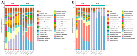 Certain researchers employed a high-throughput sequencing (HTS) methodology to explore the disparities in microbial communities and volatile metabolites across various traditional starter cultures [9]. However, a microbiological analysis is often confined to the genus level, potentially rendering the outcomes of such studies incongruent with the actual conditions. Metagenomics offers a valuable perspective by elucidating the biological relevance of microbial species that harbor crucial genes in the brewing environment. In this study, we contrasted the temporal variations in the dynamics of BAs, higher alcohols, and volatile profiles in the brewing processes of rice wines fermented with Hongqu and Xiaoqu (HQW and XQW). Additionally, metagenomic sequencing technology was utilized for the analysis of the microbial community and functional genes in the fermentation process of HQW and XQW. The aim of this study was to clarify how microbial communities affect the flavor and safety quality of HQW and XQW, and the results may be helpful to improve the flavor quality and safety of rice wine.