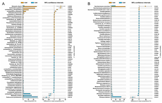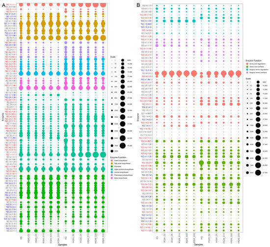 Based on the genes obtained from metagenomic sequencing, bubble plots of the abundance of functional genes corresponding to enzymes associated with flavor and BA metabolism were drawn (Figure 9). The classification of functional genes and the annotation results of microbial species are shown in Table S1. Compared with HQW, the abundance of functional genes for glycogen phosphorylase [EC 2.4.1.1], glucan 1,4-alpha-glucosidase [EC 3.2.1.3], maltose phosphorylase [EC 2.4.1.8], oligo-1,6-glucosidase [EC 3.2.1.10], and maltogenic alpha-amylase [EC 3.2.1.133] were significantly higher in the XQW brewing process. Hexokinase [EC 2.7.1.1], glucokinase [EC 2.7.1.2], and polyphosphate glucokinase [EC 2.7.1.63] possess the enzymatic capacity to catalyze the conversion of α-D-glucose into α-D-glucose 6-phosphate, which, in turn, provides a rich substrate for subsequent glycolysis pathways. In addition, hexokinase [EC 2.7.1.1] exhibited a significantly higher abundance in XQW, primarily attributed to its derivation from Rhizopus delemar, Ascoidea rubescens, and Hyphopichia burtonii. Glucose-6-phosphate isomerase [EC 5.3.1.9] and 6-phosphofructokinase [EC 2.7.1.11] play a pivotal role in catalyzing the conversion of α-D-glucose-6-phosphate into β-D-fructose 1,6-bisphosphate, and they were primarily derived from Pediococcus and Weissella cibaria. Glycerate phosphomutase [EC 5.4.2.11] facilitates the conversion between glycerate-3P and glycerate-2P, and it was primarily derived from Pediococcus, Weissella cibaria, and Pantoea in the XQW brewing process.