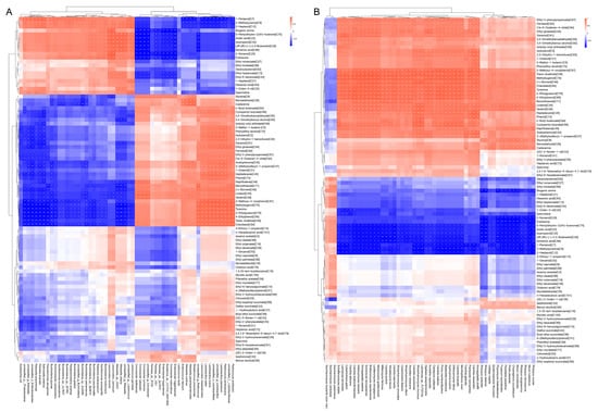 A principal component analysis (PCA) can better reflect the difference in metabolic characteristics between the two groups of samples, so we used a PCA to analyze the change trend in VOCs in the brewing processes of HQW and XQW. With the progress of fermentation, the two kinds of rice wine brewing samples were gradually separated on the PCA score scatter plot, indicating that there was a significant difference in the VOC composition during the HQW and XQW brewing processes (Figure 4B). Specifically, fermentation samples from the early stage of the HQW and XQW brewing process were primarily concentrated in the third quadrant of the PCA score scatter plot. Starting on the third day of the fermentation process, XQW underwent a positional change, transitioning from the third quadrant to the fourth. In contrast, HQW displayed a different pattern, moving from the third quadrant to the first quadrant by the seventh day of fermentation. In contrast, the sample of the mash derived from the ultimate phase of the process demonstrates that XQW brewing (XQW_D45) was mainly characterized by 1-nonanol [C41], ethyl 2-phenylacetate [C55], isobutyl octyl phthalate [C99], geraniol [C61], 3-methyl-1-butanol [C5], phenylethyl alcohol [C70], and so on. Utilizing a hierarchical clustering analysis (HCA), as depicted in Figure 4D, the categorization of the XQW and HQW mash samples revealed three distinct clusters, group I (XQW_D3-D45, group II (HQW_D7-D45), and group III (XQW_D1-D2, HQW_D1-D5), suggesting that there was a significant difference in the composition of VOCs between the two rice wines. At the early stage of fermentation, rice wine was in the stage of saccharification, and the content of volatile flavor substances in rice wine was low [29], so the volatile substances of XQW_D1-D2 and HQW_D1-D5 were similar. At the later stage of brewing, with the growth and metabolism of different microorganisms in XQW and HQW, a large number of volatile flavor substances was produced. There was a significant difference in the composition of VOCs produced during the brewing processes of HQW and XQW.