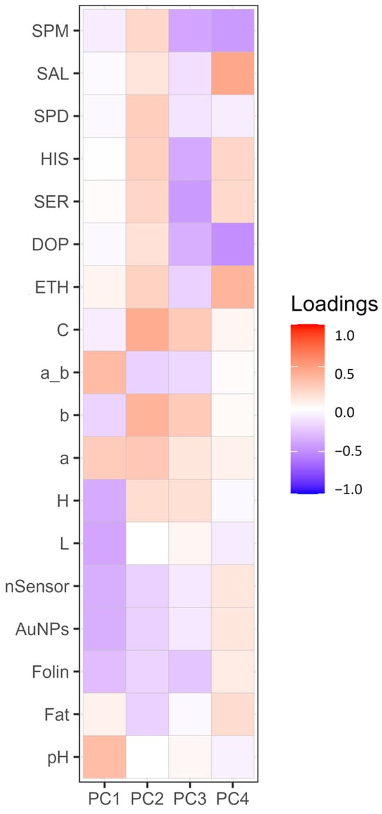 Heat map diagram displaying the loadings of variables for principal components PC1, PC2, PC3, and PC4. Different intensities are shown on the far right-hand side: deep blue and red coloration represents extremes of low and high intensity, respectively. SPM (spermine), SPD (spermidine), HIS (histamine), SER (serotonin), DOP (dopamine), ETH (ethanolamine), C (Chroma), a_b (ratio of colorimetric coordinates a* and b*), b (b* blueness/yellowness), a (a* redness/greenness), H (hue angle), L (lightness), nSensor (electrochemical nanostructured sensor), AuNPs (gold nanoparticle-based sensor).