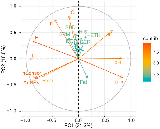 Loading plot of variables for the first two components. Different contributions are shown on the far right-hand side: deep green and orange coloration represents extremes of low and high contributions, respectively. SPM (spermine), SPD (spermidine), HIS (histamine), SER (serotonin), DOP (dopamine), ETH (ethanolamine), C (Chroma), a_b (ratio of colorimetric coordinates a* and b*), b (b*blueness/yellowness), a (a* redness/greenness), H (hue angle), L (lightness), nSensor (electrochemical nanostructured sensor), AuNPs (gold nanoparticle-based sensor).