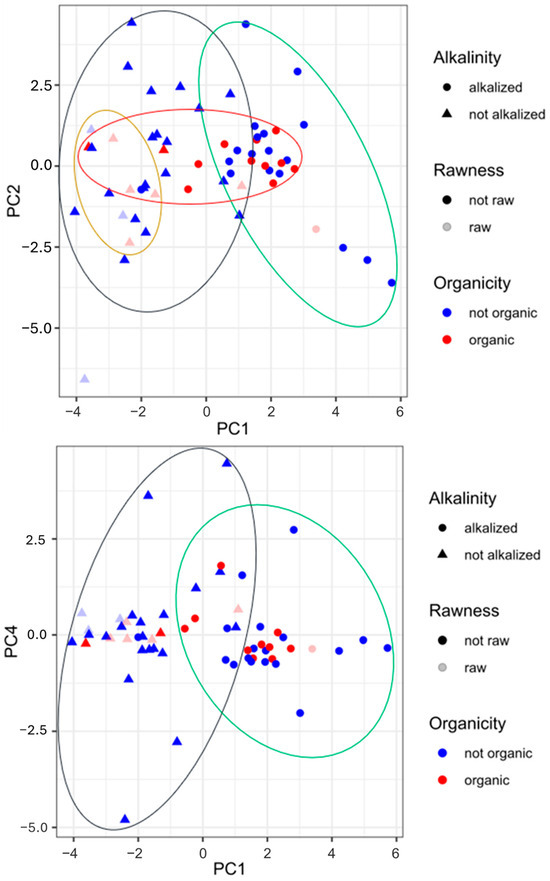 Figure 3 completes the information given in the heat map and the PCA. The graphs in Figure 3 show score plots for PC1 and PC2 and for PC1 and PC4, respectively. As visible from the first score plot, there is a strong separation between the alkalized and non-alkalized samples, highly spread for PC1. By overlapping the variable distribution (Figure 2), it is clear that pH and a*_b* ratio are discriminants for alkalized samples (on the right side of the plots), while L and H, b*, and C* are discriminants for non-alkalized samples (these have more vivid colors and are lighter). The samples, mainly blue circles, at the very far right side of the plot may be powders for which the extension of the Dutch process was longer or for which this process was conducted with different reagents (i.e., NaHCO3, K2CO3, KOH) and more intense conditions (temperature and pressure). The obtention of cocoa, and thus organic or conventional farming, and its rawness do not have a great impact on the differentiation of the samples. Regardless, in the first plot, all of the organic samples and most of the powders obtained from raw beans, no matter the technological processes employed, may be grouped. The second score plot illustrates again the marked difference between the non-alkalized and alkalized samples, spread in the horizontal direction (PC1). The other traits (organicity and rawness) are not potent enough to distinguish the samples.