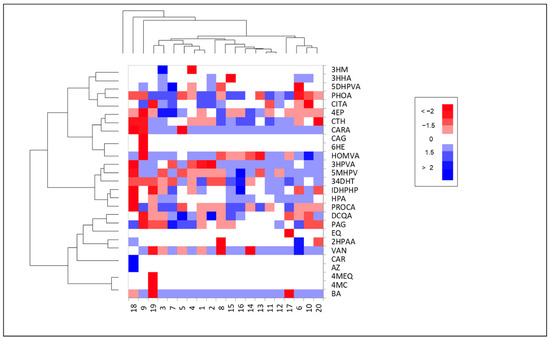 Heat map of polyphenolic metabolites at the end of intervention with foods enriched with Brosimum alicastrum Sw. seed flour. 3′-hydroxymelanettin (MH), 3-hydroxyhippuric acids (3HHA), 5-(3′,4′-dihydroxyphenyl)-valeric acid (5DHPVA), phloretic acid (PHOA), citric acid (CITA), 4′-ethylphenol (4EP), catechol (CTH), carnosic acid (CARA), caryatin glucoside (CAG), 6′-hydroxyenterolactone (6HE), homovanillic acid (HOMVA), 3-hydroxyphenyl valeric acid (3HPVA), 5-(3′-methoxy-4′-hydroxyphenyl)-valerolactone (5MHPV), 3,4-dihydroxytoluene (34DHT), isopropyl-3-(3,4-dihydroxyphenyl)-2-hydroxy-propanoate (IDHPHP), hippuric acid (HPA), Protocatechuic acid (PROCA), dicaffeoyl quinic acid (DCQA), phenylacetylglycine (PAG), equol (EQ), 2-hydroxyphenylacetic acid (2HPAA), vanillin (VAN), carnosol (CAR), azaleatin (AZ), 4′-methyl equol (4MEQ), 4′-methylcatechin (4MC), benzoic acid (BA).