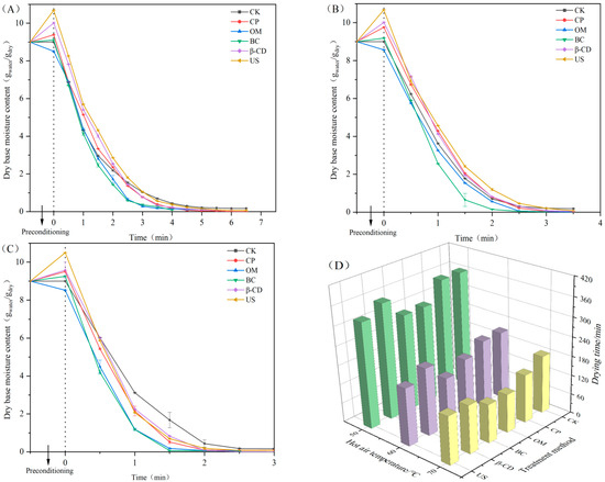 Hot air drying moisture curve and drying time of Tartary buckwheat sprouts under different pretreatment. Note: (A) Hot air drying temperature: 50 °C; (B) Hot air drying temperature: 60 °C; (C) Hot air drying temperature: 70 °C; (D) Drying time of the sprouts in each treatment group. Different lowercase letters indicate significant statistical differences (p < 0.05).