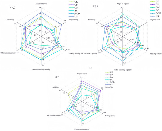 The physical characteristics of Tartary buckwheat sprout powder under different hot air drying treatments are shown in Figure 2. The angle of rest and the angle of slip can reflect the fluidity of the powder. Generally speaking, the smaller the angle of rest and the angle of slip, the better the fluidity of the powder [38]. The resting angle of Tartary buckwheat sprout powder in the CK, US, β-CD, and CP groups decreased first and then with the increase in hot air drying temperature, indicating better fluidity at 60 °C. However, under the same temperature conditions, the resting angle of samples in group BC is the lowest. This may be due to the tissue destruction during the blanching process, leading to significant nutrient loss in the sample and resulting in low viscosity [13]. The higher resting angles of US, β-CD, and OM groups may be attributed to the ease with which the tissue grinding process absorbs moisture, resulting in poor sample fluidity. The water and oil holding capacity of Tartary buckwheat sprout powder decreased gradually with the increase in hot air temperature. It may be that high temperatures damage the cell structure and cause cell damage; thus, the binding force on water molecules and oil is weakened [13]. At the same temperature, the water and oil holding capacity of the β-CD group were the highest at 7.63 and 6.23 g·g−1, respectively.