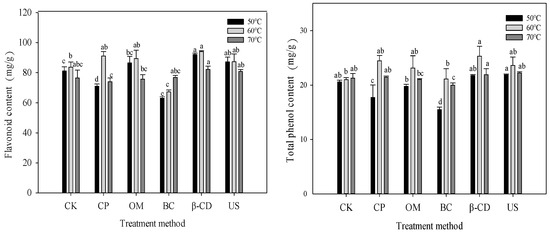 As shown in Figure 3, with the increase in temperature, the contents of total flavonoids and total phenols first increased and then decreased. It was concluded that at 60 °C, the contents of total flavonoids in CP, OM, β-CD and US groups were 91.12 mg/g, 89.44 mg/g, 94.12 mg/g and 87.34 mg/g, respectively, which were increased by 8.76%, 6.76%, 12.34% and 4.25% compared with CK group, respectively. The content of total flavonoids in BC group was the lowest. In contact with water during heat treatment, rutin will be converted into quercetin under the action of enzymes, which will lead to a reduction in flavonoid content. For total phenol content, the highest total phenol content in β-CD group was 25.30 mg/g at 60 °C. At 50 °C, the total phenol content of BC group was at least 15.49 mg/g. According to the test results, citric acid color protection, sodium chloride penetration, β-cyclodextrin treatment and ultrasonic treatment can only reduce the loss of active ingredients in the hot air drying process of Tartary buckwheat sprouts to a certain extent, and β-cyclodextrin treatment has the best effect.