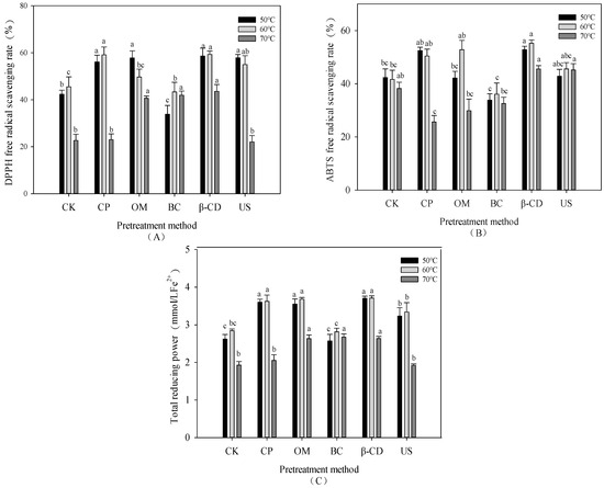 Effect of hot air drying on antioxidant capacity of Tartary buckwheat sprouts under different pretreatment conditions: (A) DPPH free radical scavenging rate; (B) ABTS free radical scavenging; (C) Total reducing power. Note: Different lowercase letters indicate significant statistical differences (p < 0.05).