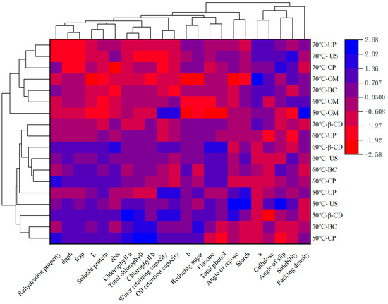 Figure 5 shows the heat map clustering analysis of various data under different hot air drying methods. From the figure, we can see the difference in classification among various hot air drying methods and the correlation between the expression of various indicators. All hot air drying methods can be divided into two categories. The first group includes CP, OM, β-CD, CK, and US under the conditions of hot air drying at 70 °C, as well as OM at 50 °C and 60 °C. The second group was the β-CD group at 70 °C and the pretreatment group at 50 °C and 60 °C. It is evident that the effects at 50 °C and 60 °C are similar. Furthermore, the contents of rehydration, L*, total flavonoids, total phenols, ABTS, DPPH, FRAP, and other antioxidant indexes were expressed at a high level under hot air drying at 60 °C. The content of starch and cellulose was low. At 50 °C, chlorophyll, water holding capacity, oil holding capacity, and other indexes had higher expression. Therefore, under the condition of hot air drying at 60 °C, the active ingredients and antioxidants of Tartary buckwheat sprouts have higher advantages, and the contents of total flavonoids and total phenols in the β-CD group are the highest.