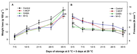 Evolution of weight loss (g 100 g−1) (A) and fruit firmness (N mm−1) (B) of Hass avocado treated with distilled water (control), 1-MCP at 0.3 µL L−1, GABA at 1 mM, and the combination of 1-MCP and GABA (M+G) during storage at 5 °C plus 5 days at 20 °C. The data are the mean ± SE (n = 3). Different lowercase letters show significant differences (p < 0.05) among treatments for each sampling date.