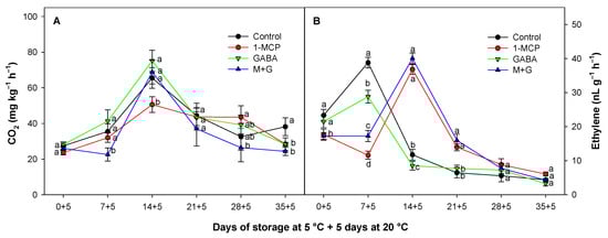 Evolution of respiration rate (mg CO2 kg−1 h−1) (A) and ethylene production (nL g−1 h−1) (B) of Hass avocado treated with distilled water (control), 1-MCP at 0.3 µL L−1, GABA at 1 mM, and the combination of 1-MCP and GABA (M+G) during storage at 5 °C plus 5 days at 20 °C. The data are the mean ± SE (n = 3). Different lowercase letters show significant differences (p < 0.05) among treatments for each sampling date.