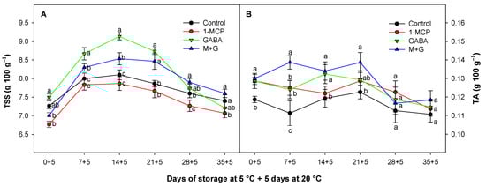 Evolution of total soluble solids (TSSs) (g 100 g−1) (A) and total acidity (TA) (g 100 g−1) (B) of Hass avocados treated with distilled water (control), 1-MCP at 0.3 µL L−1, GABA at 1 mM, and the combination of 1-MCP and GABA (M+G) during storage at 5 °C plus 5 days at 20 °C. The data are the mean ± SE (n = 3). Different lowercase letters show significant differences (p < 0.05) among treatments for each sampling date.