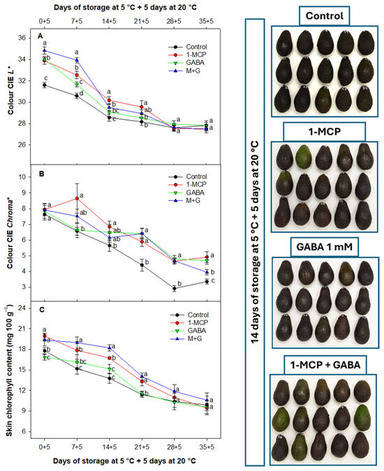 Appearance and evolution of skin external color CIE L* (A), CIE Chroma* (B), and skin chlorophyll content (mg 100 g−1) (C) of Hass avocado treated with distilled water (control), 1-MCP at 0.3 µL L−1, GABA at 1 mM, and the combination of 1-MCP and GABA (M+G) during storage at 5 °C plus 5 days at 20 °C. The data are the mean ± SE (n = 3). Different lowercase letters show significant differences (p < 0.05) among treatments for each sampling date.