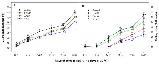 Evolution of electrolyte leakage (%) (A) and CI (0–10 scale) (B) of Hass avocado treated with distilled water (control), 1-MCP at 0.3 µL L−1, GABA at 1 mM, and the combination of 1-MCP and GABA (M+G) during storage at 5 °C plus 5 days at 20 °C. The data are the mean ± SE (n = 3). Different lowercase letters show significant differences (p < 0.05) among treatments for each sampling date.