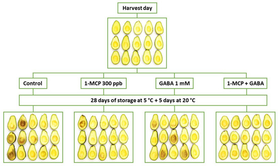 For GABA (Sigma-Aldrich, Madrid, Spain), freshly prepared 1 mM solutions were used for immersion treatments performed for 10 min. This treatment was selected among different GABA concentrations (1–10 mM) and immersion times assayed (10 min and 1 h) in previous experiments (Figures S1 and S2). For the 1-MCP (SmartfreshTM, Agrofresh Inc., Philadelphia, PA, USA) and control treatments, distilled water immersions were also applied for 10 min to provide the same conditions. All solutions contained tween-20 (Sigma-Aldrich, Madrid, Spain) 0.05% v/v. In this sense, 25 avocados were soaked in 10 L of control or GABA solution for each replicate (n = 3) and treatment. This ensured thorough coverage and consistent treatment of the fruit. Following treatments, all the fruits were exposed for a drying period at 20 °C (one hour) before being transferred to individual 130 L plastic containers, ensuring consistent conditions across all batches. These containers were then tightly sealed, allowing 1-MCP to take effect over 24 h at 20 °C, while control and GABA 1 mM batches were exposed to ambient air in similarly sealed containers at the same temperature. The application of 1-MCP treatments involved the utilization of commercial tablets, releasing 0.3 µL L−1, alongside a commercial activator solution provided by SmartFresh (Agrofresh®). For 1-MCP, the optimum concentration applied on these fruits was chosen from those tested on this cultivar by Defilippi et al. [23]. Afterward, these fruits were stored for 35 days at 5 °C and 90% relative humidity, followed by an additional 5-day period at 20 °C for subsequent shelf-life assessments. When stored at 5 °C, CI symptoms could be observed [23], and this temperature was used with simulated shipments studies for this avocado cultivar [24]. All reagents used in this study were of analytical purity.
