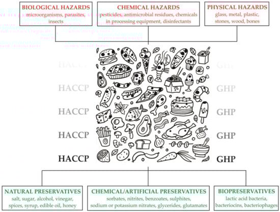 Food contamination refers to the condition in which food is no longer suitable for consumption due to the presence of undesirable biological, chemical, or physical agents (Figure 1). Biological hazards include microorganisms (bacteria, viruses, yeasts, molds), parasites, and insects [1]. Some of them are pathogenic or can produce toxins. Pathogenic microorganisms cause diseases that can vary in severity, extent, and consequences. Chemical hazards can come from pesticides or antimicrobial residues, chemicals in processing equipment, or disinfectants. Physical hazards include hard or sharp objects such as glass, metal, plastic, stones, wood, and bones, which can cause choking, cuts, or broken teeth. There are also undesirable foreign objects (hair, insects, and sand), but these are less likely to cause injury. Finally, a fourth type of contaminant is allergens (e.g., gluten) [2]. Food contamination can be primary (by air, soil, polluted waterways, pesticides used in agriculture, mycotoxins) or secondary (during production, transportation, storage, originating from packaging—primary packaging material or ambient conditions—polluted environment). It is therefore important to know all elements and carry out a risk assessment, as well as necessary to implement and comply with the Hazard Analysis Critical Control Point (HACCP) system and Good Hygiene Practices (GHP) during the preparation, storage, distribution, and serving of food [3].