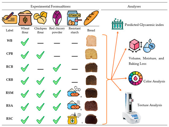 Common white wheat flour was kindly supplied by Macinazione Lendinara SpA (Arcole, Italy). The wheat flour label detailed the following composition: 343 kcal/100 g, fat 1.2 g/100 g, total carbohydrates 70 g/100 g, protein 12 g/100 g, and dietary fiber 2.3 g/100 g. Red Chicory leaves (Cichorium intybus L.) were provided by GEOFUR, a local consortium of Verona (Legnago, Italy). The leaves were dried in an oven at 50 °C for 16 h, ground with Grindomix GM 200 (Retsch, Haan, Germany), and went through a sieve with meshes of 0.2 mm to achieve a fine powder that has the following nutritional characteristics: 240 kcal/100 g, total carbohydrates 23.5 g/100 g, fat 3.3 g/100 g, fiber 27.4 g/100 g, and protein 15.8 g/100 g. The chickpea flour was purchased from Molino Rossetto (Padova, Italy), with the following composition: 355 kcal/100 g, fat 6.6 g/100 g, total carbohydrates 4.1 g/100 g, fiber 9 g/100 g, protein 21 g/100 g, and salt 0.03 g/100 g. Gluten, RSs, and guar gum were provided by ABS Food srl (Padova, Italy), and other ingredients such as sugar, salt, and dried yeast were purchased from a local market. The breads were prepared with a commercial breadmaking machine (Panexpress 750 Metal, model 0132/00—Ariete, Trieste, Italy). Doughs were mixed with a blender (Kenwood, Chef XL KVL4110S, Treviso, Italy), fermented for 3 h at room temperature, and then cooked at 170 °C for 2 h. The overview of the experimental bread formulations and analyses are reported in Figure 1, while the sample formulations expressed as percentages are reported in Table 1.