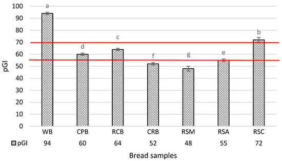 Predicted glycemic index of bread samples. The values are reported below the sample labels. Values with different superscripts are significantly different at p < 0.05. pGI: predicted glycemic index; WB: white bread; CPB: bread with 30% chickpea flour; RCB: bread with 10% red chicory powder; CRB: bread with 30% chickpea flour and 10% red chicory powder; RSM: bread with 30% chickpea flour, 10% red chicory powder, and 15% chemically modified tapioca resistant starch; RSA: bread with 30% chickpea flour, 10% red chicory powder, and 15% retrograded tapioca resistant starch; RSC: bread with 30% chickpea flour, 10% red chicory powder, and 15% pregelatinized corn resistant starch. The horizontal lines indicate the values of low GI (up to 55), medium GI (ranging from 56 to 69), and high GI (above 70).