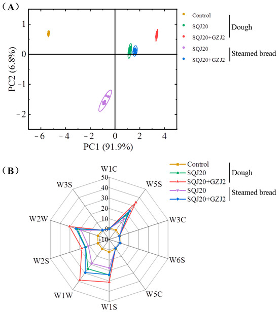 E-nose analysis of different dough and steamed bread fermented by S. cerevisiae SQJ20 with or without W. anomalus GZJ2. (A) Principal component diagram; (B) Radar map.