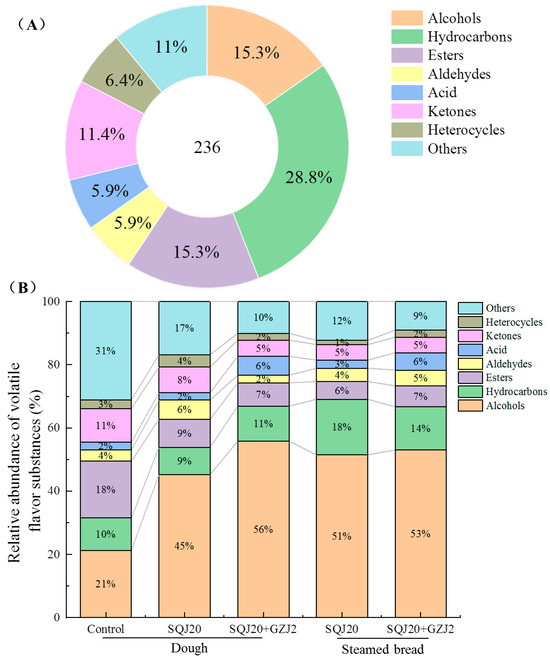 Dynamic changes in volatile substances and their contents in the dough or steamed bread fermented by S. cerevisiae SQJ20 with or without W. anomalus GZJ2. (A) The amount of various volatile substances; (B) Stack diagram of the relative abundance of volatile substances.