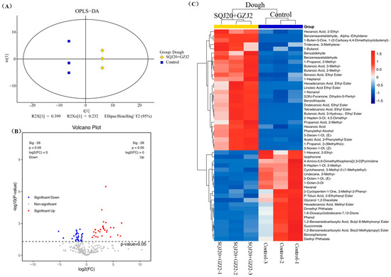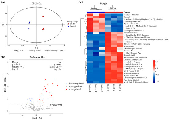 Effect of S. cerevisiae SQJ20 (In short: SQJ20) on the formation of volatile substances in fermented dough compared with the unfermented dough (Control). (A) OPLS-DA score chart; (B) Volcanic maps; (C) Heat map.