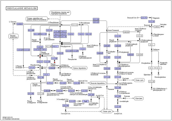Phenylalanine metabolic pathways during dough fermentation. Note: Red represents upregulated metabolites.