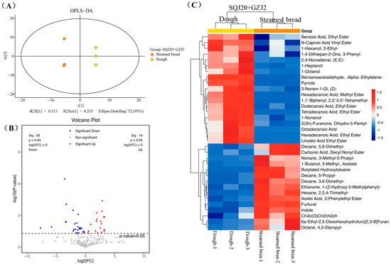 Effect of steaming on the formation of volatile substances in co-fermented steamed bread compared to dough co-fermented by W. anomalus GZJ2 and S. cerevisiae SQJ20. (A) OPLS-DA score chart; (B) Volcanic maps; (C) Heat map.
