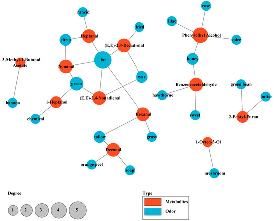 Remarkably, aldehydes made important contributions to the aroma of steamed bread, including Hexanal, Heptanal, Nonanal, Decanal, (E,E)-2,4-Decadienal, (E,E)-2,4-Nonadienal, and Phenylacetaldehyde. Among them, (E,E)-2,4-Decadienal was the volatile aroma substance with the largest ROAV value (ROAV = 100) in steamed bread fermented by S. cerevisiae SQJ20 with or without W. anomalus GZJ2, contributing to the aroma of fried, waxy, and fat, which was related to the lipid oxidation reaction of flour [2,24]. Compared with those of steamed bread fermented by S. cerevisiae SQJ20, the ROAVs of (E,E)-2,4-Nonadienal (ROAV = 22.85) and Nonanal (ROAV = 12.16) in the co-fermented steamed bread increased, indicating that the addition of W. anomalus GZJ2 improved the aroma of fat, citrus, green, and wax. Meanwhile, the ROAV of Decanal in co-fermented steamed bread decreased compared with that of steamed bread fermented by S. cerevisiae SQJ20, and the ROAVs of Hexanal and Heptanal had similar values, which were the common flavor substances in steamed bread that come from the flour itself [26]. A further correlation analysis between aroma substances and aroma characteristics in the co-fermented steamed bread (Figure 7) confirmed that fat aroma was prominent and associated with five aldehydes, indicating that aldehydes were important sources in complex fermented steamed bread.