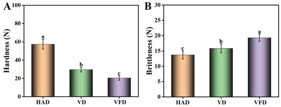 Effects of drying methods on the hardness and brittleness of mulberry. (A) Hardness. (B) Brittleness. HAD: hot air drying. VD: vacuum drying. VFD: vacuum freeze-drying. Different letters represented statistically different values at p < 0.05.