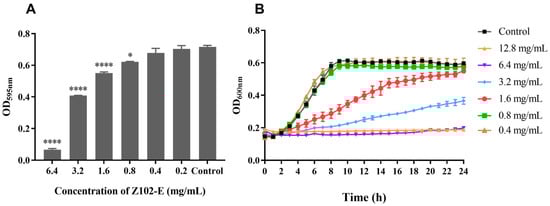 The antibacterial efficacy of Z102-E against L. monocytogenes. (A) The effects of Z102-E on L. monocytogenes growth. (B) The growth curves of L. monocytogenes treated with different concentrations of Z102-E. The significance levels are shown as * p < 0.05 and **** p < 0.0001 compared to the data of control.