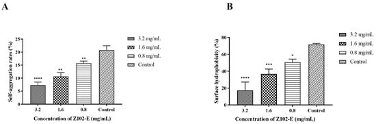The effects of Z102-E on the self-aggregation and surface hydrophobicity. (A) Inhibition effects on self-aggregation. (B) Inhibition effects on surface hydrophobicity. The significance levels are shown as * p < 0.05, ** p < 0.01, *** p < 0.001, and **** p < 0.0001 compared to the data of control.