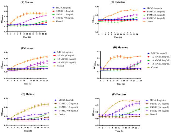 The effects of Z102-E on the utilization of different sugars of L. monocytogenes. (A–F) refer to different sugars.