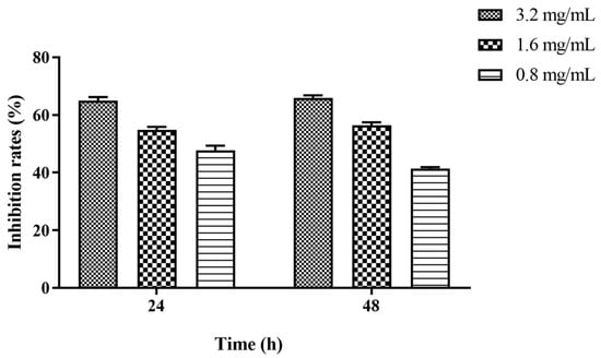 Different concentrations of Z102-E were found to remarkably suppress the formation of L. monocytogenes biofilm and reduce the biofilm biomass, demonstrating a dose–response relationship. After 24 h treatment with 3.2 mg/mL and 1.6 mg/mL Z102-E, the amount of biofilm decreased by 64.97% and 54.78%, respectively (Figure 5). When the treatment time reached 48 h, the inhibition rates of the biofilm were 65.97% and 56.38%.