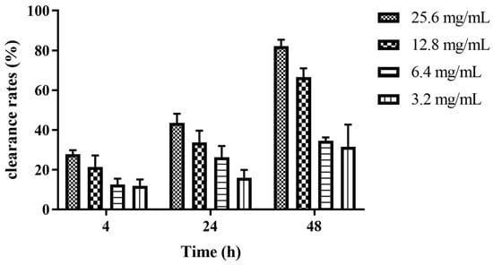 Different concentrations of Z102-E exhibited obvious effects on the removal of the L. monocytogenes biofilm, and the removal rate was positively correlated with the concentration of Z102-E and the treatment time. When treated at 25.6 mg/mL and 12.8 mg/mL, the removal rates were 20.85% and 21.43% at 4 h, 30.08% and 33.76% at 24 h, and 62.07% and 66.62% at 48 h, respectively. Z102-E showed an excellent removal effect at 48 h (Figure 6).