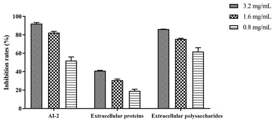 The AI-2 system is a quorum-sensing signal shared by Gram-negative and Gram-positive bacteria; it is critical for regulating bacterial motility and biofilm formation [31,32]. The AI-2 signal molecules were inhibited by Z102-E at 3.2 mg/mL and 1.6 mg/mL of Z102-E, and the inhibition rates were 60.18% and 82.44%, respectively (Figure 7).