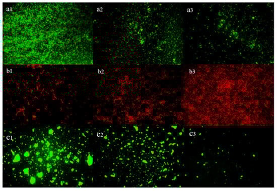 Inverted fluorescence microscopy observation of cells and EPS in biofilm (400×). (a) live cells; (b) dead cells; (c) EPS; subscripts 1–3 indicate different concentrations of Z102-E (0, 1.6, and 3.2 mg/mL).