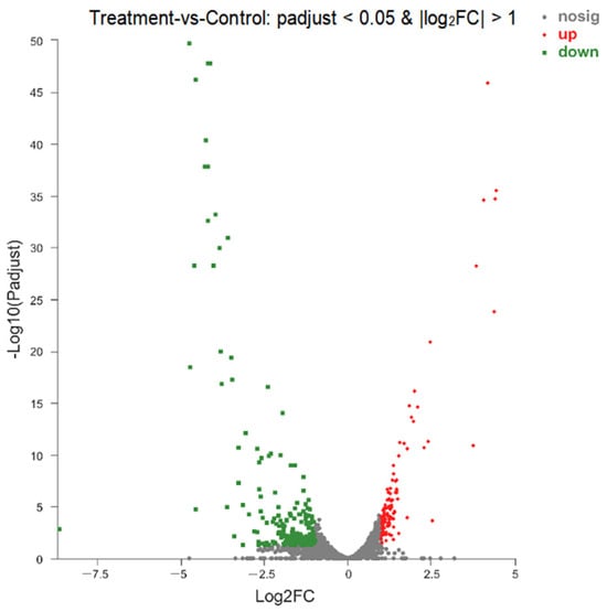 Transcriptomics was used to analyze the gene expression differences between the Z102-E-treated group and the control. The quality control results indicated that the sequencing data of all the samples could be further used for bioinformatics analysis (Tables S1 and S2). A total of 2931 internal reference genes were identified, with 331 showing significantly differential expression (|log2FC| ≥ 1.0 and p-adjusted < 0.05). Among them, 117 genes (3.99%) were up-regulated, while 214 genes (7.30%) were down-regulated.