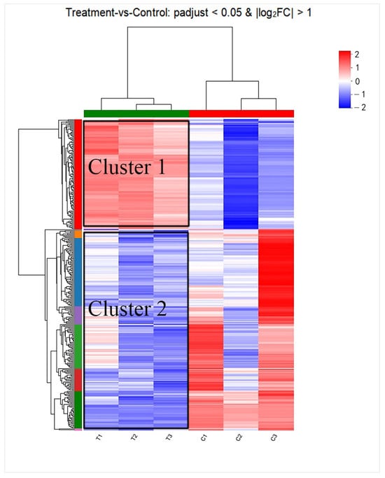 Distance matrices were generated to represent the distance between samples. Genes sharing similar biological functions often clustered together. To visually analyze the significant DEGs between the control group and the Z102-E-treated group, we performed a cluster analysis on these DEGs. As shown in Figure 10, unsupervised clustering resulted in the formation of two main gene clusters. In the Z102-E-treated group, Cluster 1 comprised 35.35% of the DEGs, with 117 up-regulated genes, while Cluster 2 accounted for 64.65% of the DEGs and contained 214 down-regulated genes.